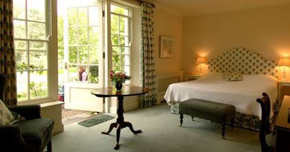 The 29 bedrooms are spread out over the main house and courtyard of a lime-washed, rose-covered, farm building adjacent to the main house. The rooms are all individually decorated in a simple and elegant way and all have en-suite bathrooms. Some rooms are large and airy with beautiful views over the fields; some are cosier rooms at the top of the house in the eaves; and some are newer, light-filled garden rooms at the back of the house looking towards the river and horse chestnut trees beyond.