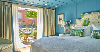 Stockbridge is officially England’s ‘smallest town’, the heart of fly fishing country with the River Test meandering through. Its wide high street was once a drover’s road where vast flocks of sheep used to pass through en route from Wales. The Grosvenor sits in pride of place in this pretty Georgian town surrounded by beautiful countryside. Traditional yet colourful, the hotel has been completely renovated to a very high standard by new owners, Simon and Teresa Henderson, with both the interiors and the fabulous courtyard garden designed by Lottie Keith.