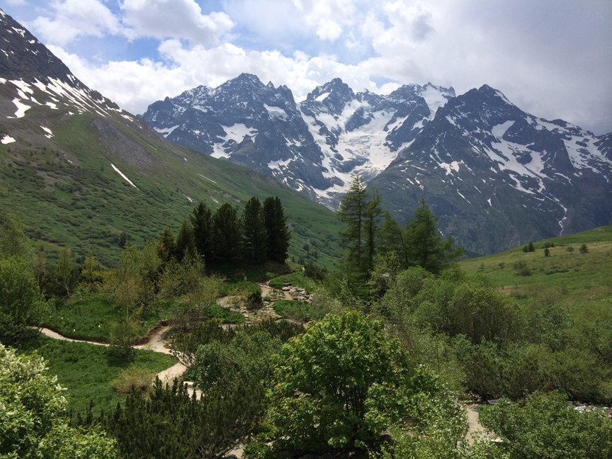 View of the glaciers of La Meije from the Jardin Alpin du Lautaret at 2100m altitude.